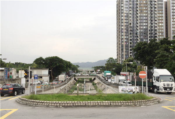 由十八鄉路交匯處所見,即使在非最高峰時段,僑興路(左)、公庵路(右)及明渠遠處舊橋均出現大塞車情況。記者周駿攝