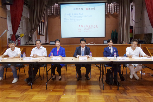 元朗區議會議員與當區居民一起座談,討論交通問題。左起:林添福、程振明、袁敏兒、梁明堅、沈豪傑、梁福元。