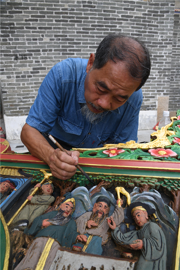 廟內還有一幅大型木掛畫,早已復修過了,但仍有不少瑕疵,經驗豐富的麥榮要為它執手尾。例如將平面的樹,以黑色表現其質感,暗位要呈現立體感,他說,這種做法叫「皴」,是中國畫筆法,表現山石、峰巒和樹身質感的脈絡紋理。