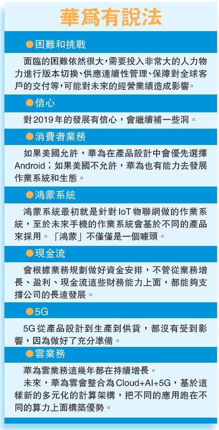 雖然華為董事長梁華表示下半年華為的壓力會比較大,但項立剛認為這可能只是低調的說辭。他表示,華為在內地市場幾乎沒有受到美國的影響,反而可能因為民眾的愛國心而增加華為的手機銷量。美國對華為的打擊,受影響的主要是海外。中美正在上海進行談判,此次談判中美國不太可能會全面放松對華為的限制。這也是梁華說下半年壓力較大的最主要原因。海外消費者可能會因為擔心華為無法使用安卓系統而放棄購買華為。但對於美國政府來說,它打擊華為的目的並不是單純為了把華為搞倒,而是為了增加貿易談判的籌碼。中美元首在G20會議會晤的時候,美國就對華為鬆動了一些。