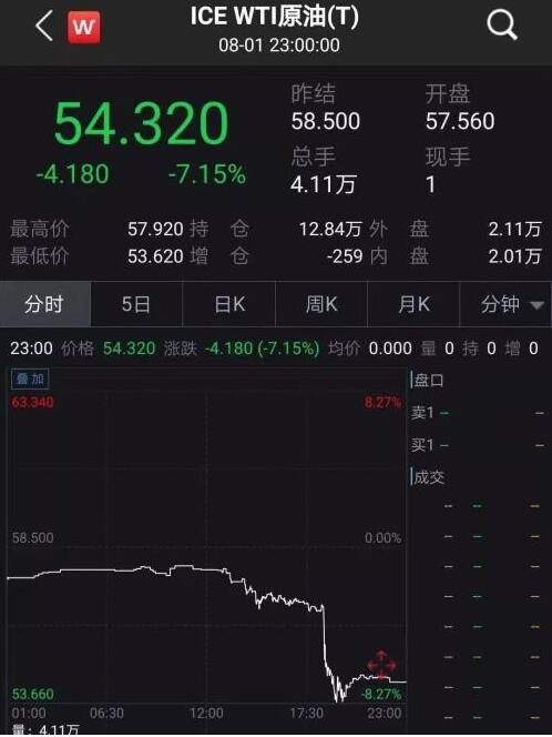 紐約商品交易所9月交割的西德州中質原油(WTI)期貨價格重挫4.63美元,跌幅達7.9%,收於53.95美元/桶,創6周以來的最低收盤價。這是主力WTI期貨4年來的最大單日跌幅。