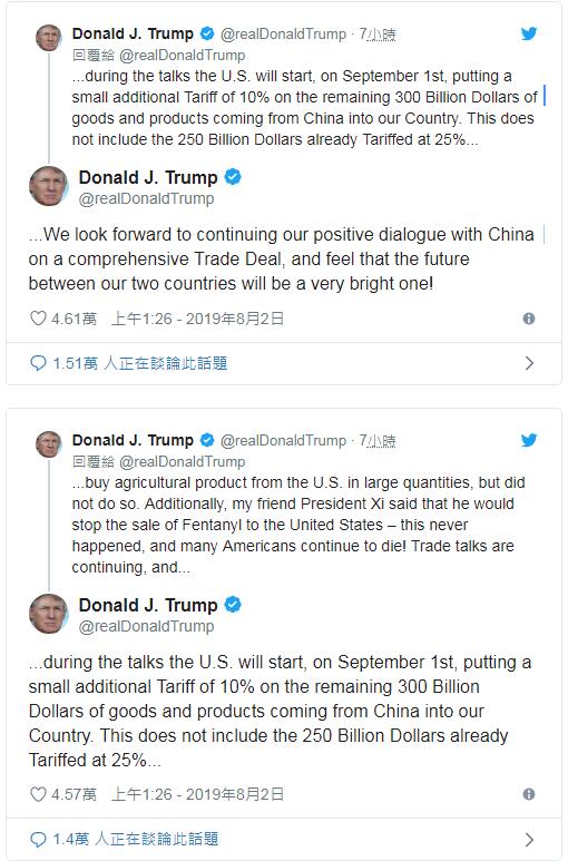 川普推文說,「…在談判期間,美國將從9月1日起開始對其餘3千億美元的中國進口商品小幅加徵10%關稅。這不包括已課徵25%關稅的2500億美元商品…」