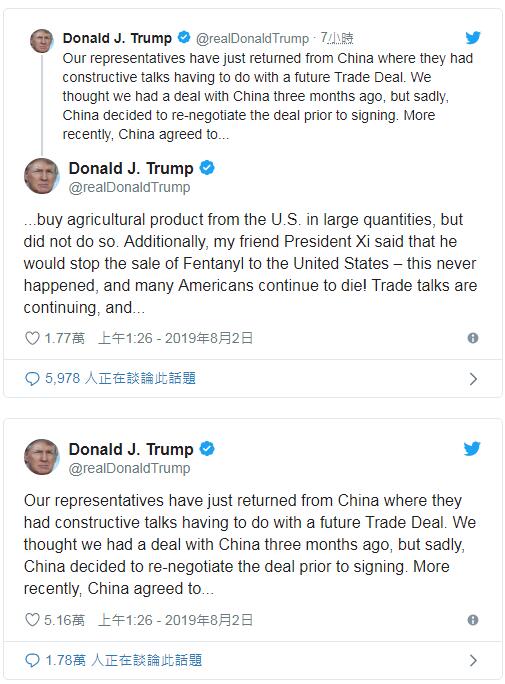 川普接連發佈一連串推文,表示美方貿易代表團剛從中國返美,雙方就未來的貿易協議進行建設性會談;美方以為,3個月前就與中方達成協議,遺憾的是,中方決定重談…最近中方同意向美國購買大量農產品,但沒有執行。此外,「我的朋友」習主席曾說,將阻止芬太尼(Fentanyl)流入美國,但也沒發生,「許多美國人持續死亡!...」。