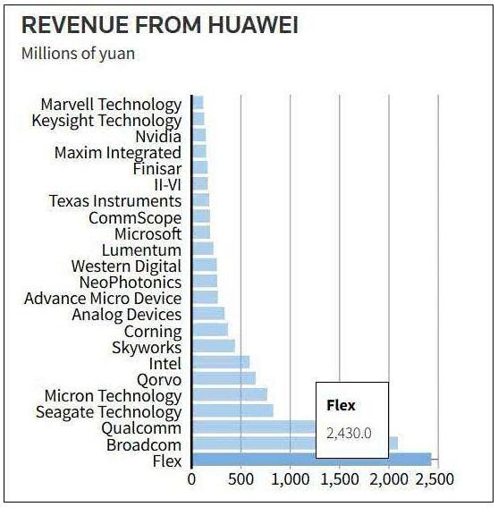 彭博社统计的数据显示,仅去年第三季度,伟创力就从华为获得了24.3亿元人民币的收入,是从华为获利最多的美国供应商,这部分收入约占其当季总营收的5%。