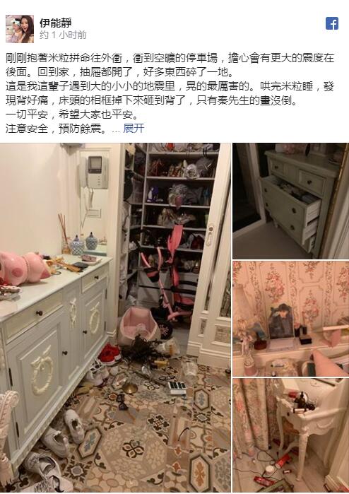 台湾艺人伊能静事后在社交媒体公开地震后家中的惨况,不仅东西碎了一地,连她的后背也被床头的相框砸到,“这是我这辈子遇到大的小小的地震里,晃的最厉害的。”她表示,地震发生时,第一时间就抱着3岁女儿往外冲到空旷停车场。