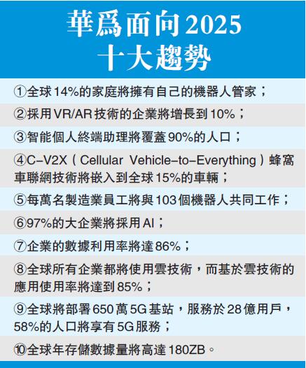 【又訊】華為昨日發布「面向2025十大趨勢」。華為預測,到2025年,智能技術將滲透到每個人、每個家庭、每個組織,全球58%的人口將能享有5G網絡,14%的家庭擁有「機器人管家」,97%的大企業採用AI。