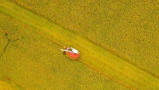 资料图:湖北枝江市问安镇方家畈村,收割机驰骋在田间收割作业,丰收在望。