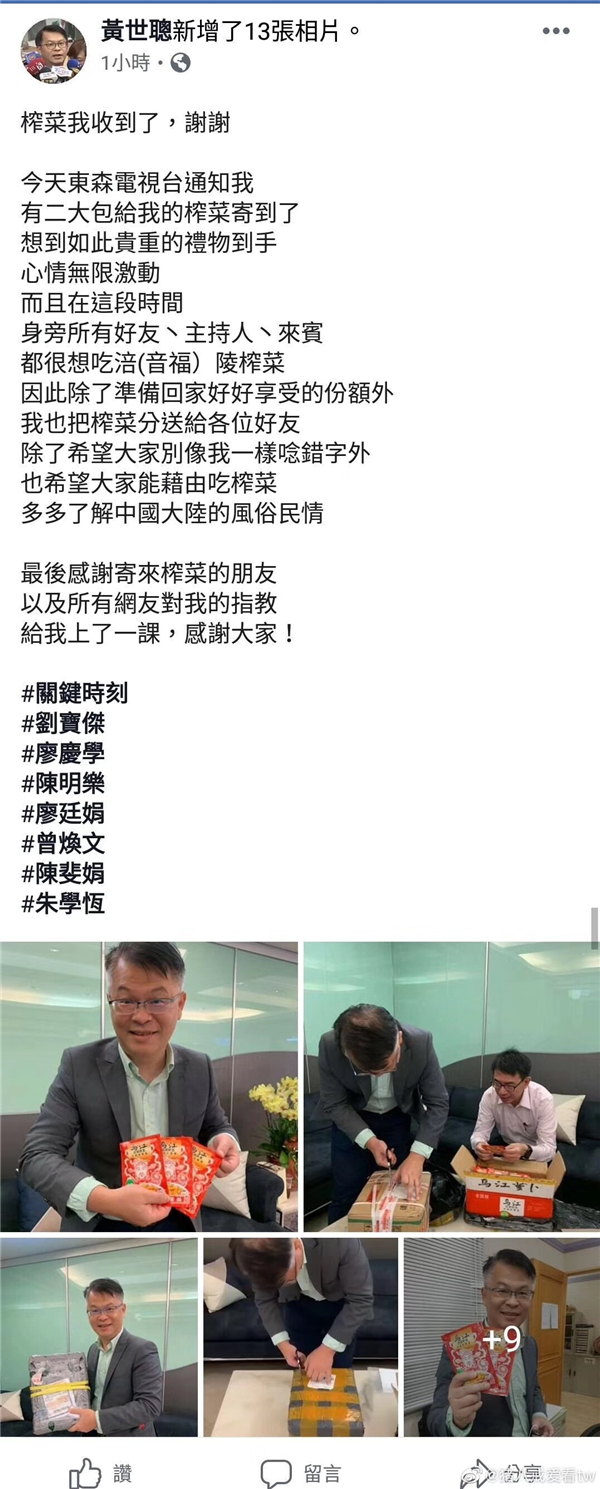 台湾电视「名嘴」黄世聪日前在节目中声称「大陆人吃不起榨菜」,引发两岸网友群嘲。近日,大陆乌江涪陵榨菜公司安排寄送榨菜给黄世聪,也有网友表示要给他邮寄。黄世聪16日发文表示已经收到了两箱榨菜,并说「想到如此贵重的礼物到手,心情无限激动」,他还说希望大家别像他一样念错字,多多了解中国大陆的风俗民情。