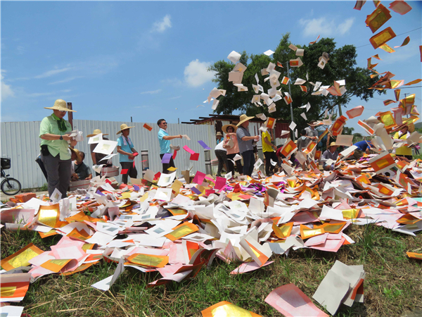 與會者將紙紮祭品逐些逐些放在空地上待火化。