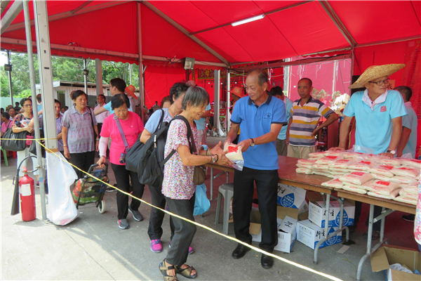 食物祭品最後由會員分配領走,這些食品有雞、燒肉 、潮州麵、米、生果、餅食、糕點等。