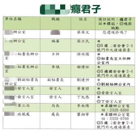 据台湾“中时电子报”报道,国民党团公布蔡办“瘾君子名单”,包括蔡办编审蔡立民、蔡办秘书长办公室主任游尚儒、蔡办秘书长办公室参议谢博任、蔡办副秘书长刘建忻、蔡办发言人黄重谚及丁允恭、蔡办第三局长李南阳还有政风处长萧湘宁,爆料内容更点明以上所有人在总统府的哪些场所抽烟。