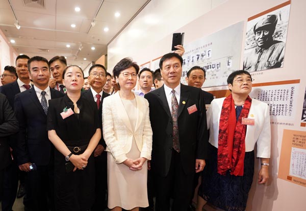 朱德之孫朱和平(右二)、孫女朱新華(右一)等陪同林鄭月娥參觀展覽。中新社