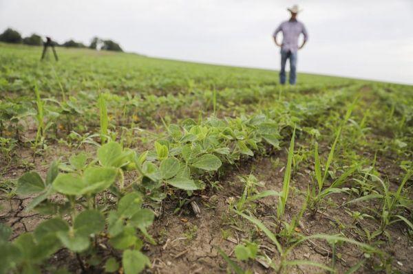 6月18日,在美國艾奧瓦州大西洋鎮,農場主比爾·佩雷特的兒子傑伊·佩雷特在自家田地裏查看大豆的生長情況。(王迎 攝)