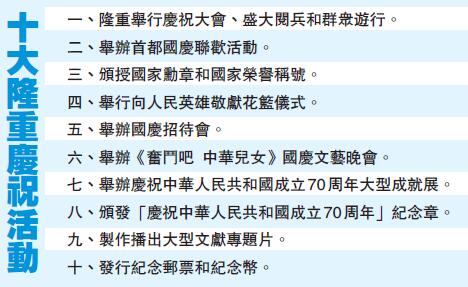 據介紹,慶祝活動將充分展示中華人民共和國成立70年來的光輝歷程、偉大成就和寶貴經驗,突出展示黨的十八大以來,以習近平為核心的黨中央團結帶領全黨全軍全國各族人民進行偉大鬥爭、建設偉大工程、推進偉大事業、實現偉大夢想,推動黨和國家事業取得的歷史性成就,發生的歷史性變革。