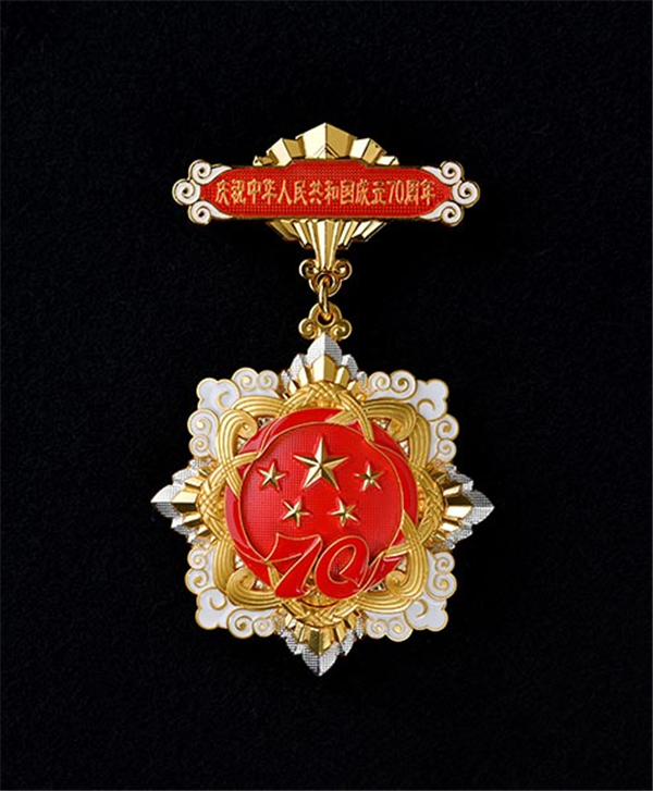 紀念章使用銅胎鍍金材質,通徑為50毫米,主要元素為五星、「70」飄帶、團錦結、如意祥雲和光芒,主色調為紅色和金色。核心部分為五星,代表國家榮譽。「70」飄帶象徵中華人民共和國70年奮鬥歷程。團錦結環繞在五星和「70」飄帶周圍,寓意全國各族人民大團結,構建人類命運共同體的願景。章體外環以如意祥雲、光芒構成,象徵人民對美好生活的嚮往,同時表達隆重慶祝中華人民共和國生日,禮讚國家富強、民族振興、人民幸福的輝煌成就,以及在70年輝煌奮鬥成就的基礎上不忘初心、繼續前進的堅定決心。