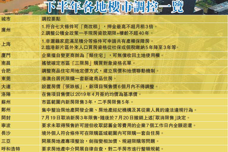 【香港商報网訊】近期,中央再次重申堅持「房住不炒」,並提出不將房地產作為短期刺激經濟的手段。進入2019年下半年以來,至少已有15個城市出台樓市調控政策。其中部分城市為房價設置「漲停板」,限制房價過快上漲;部分城市強化監管,避免房企、中介「鑽空子」;也有城市在房屋租賃等方面出台政策,通過一系列措施,促進房地產市場健康發展。