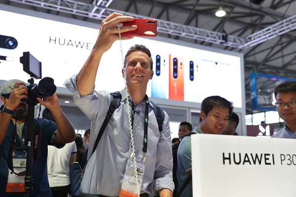 華為在2019 亞洲消費電子展備受關注,圖為境外媒體使用華為手機自拍。中新社