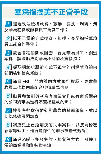 華為稱,一段時間以來,美國政府不僅動用其政治和外交影響力,遊說各國政府禁止使用華為設備,更是動用其國家機器,濫用司法、行政權力,採用各種不正當手段騷擾、影響華為或合作夥伴的正常業務。