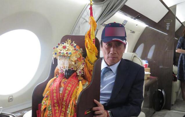 郭台铭与他恭迎的妈祖、关公神像一同搭乘专机前往美国。图自中评社
