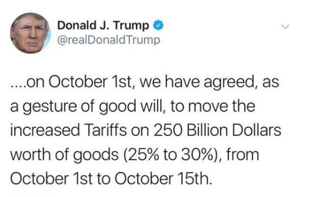 特朗普在推特上表示,應中國國務院副總理劉鶴的要求,以及鑒於中國將於10月1日慶祝成立70周年,美國已同意將針對價值2500億美元商品的加徵關稅稅率的上調(從25%調至30%)實行時間從10月1日改為10月15日,以示善意。