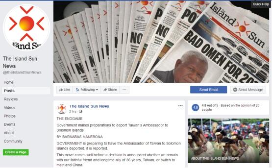 【环球网综合报道】所罗门群岛当地媒体《岛屿太阳报》(Island Sun)今日(16日)在脸书刊出一则报道,爆料说“所政府正准备驱逐台湾驻所罗门‘大使’廖文哲”,并称“廖文哲干预所罗门群岛的内政”。