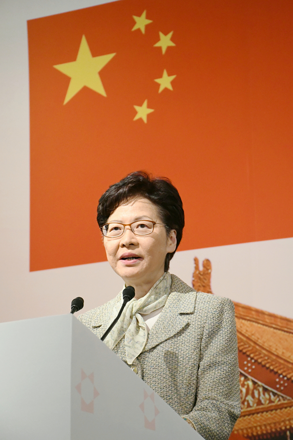 林鄭月娥在致辭時表示,中華出入口商會推動內地與香港經貿合作,見證經濟騰飛作出貢獻,國家在經濟、社會、民生等各個方面都有長足的發展,香港承擔起連接內地及其他國家的橋樑,希望未來抓住機遇,積極參與「大灣區」及「一帶一路」建設,務求為「國家所需」發展「香港所長」。