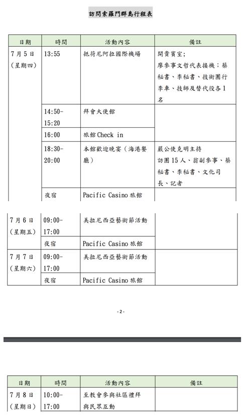 以“赴所罗门群岛参加第6届美拉尼西亚艺术文化节及国庆”为例,这个行程发生于2018 年7 月4 日至13 日,由“原住民族文化发展中心”主任曾智勇率13 名歌舞剧团员出访,从“日程安排表”来看,每日的行程大多只是粗略概括为“美拉尼西亚艺术节活动”,此次行程8 天总共只表演了12 首曲目,充其量只能算一次演出强度极低的文艺交流活动。但报告中却大肆渲染“专业演出震撼美拉尼西亚区域各国,不论是演出内容、服装、人员素质、人数规模皆展现‘国家级’原住民族乐舞团队规格,所方相对提高接待层级,透过此次展演机会,将开启台湾与美拉尼西亚区域文化合作新思维,增进双方文化理解及情谊,同时藉此行成果之展现,看见‘我国’‘新南向政策’的高度发展性,让台湾在国际互动的历程当中,迈向全新的进程。”