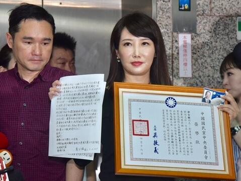 12日,蔡沁瑜赴台北市中正区党部退还郭台铭党证及荣誉状。(图源:东森新闻云)