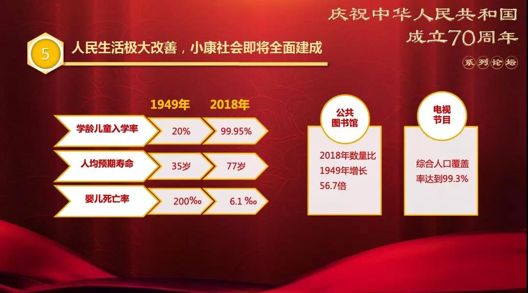70年來,我國人民生活從溫飽不足到總體小康,正在邁向全面小康。按現價計算,我國人均GDP從1952年的119元,提高到2018年的64644元,已達到上中等收入國家水平。居民收入和消費不斷增長,2018年居民人均可支配收入、人均消費支出分別比1949年、1956年實際增長59.2倍、28.5倍,2018年全國居民消費支出中食品支出比重,比1978年降低35.5個百分點。就業總量大幅增加,全國就業人員從1952年的2.07億人擴大到2018年的7.76億人,第二、三產業就業人員占全部就業人員比重從1978年的29.5%上升為2018年的73.9%。黨的十八大以來,就業優先政策得到有效實施,全國城鎮新增就業連續6年超過1300萬人。教育事業成就顯著,學齡兒童入學率從1949年的20%提高到2018年的99.95%;勞動年齡人口平均受教育年限由1982年的5.3年提高到2018年的10.6年。文化事業繁榮發展,2018年公共圖書館數量比1949年增長56.7倍,電視節目綜合人口覆蓋率達到99.3%。醫療衛生事業深入發展,人均預期壽命從1949年的35歲上升為2018年的77歲,嬰兒死亡率由建國初的200‰下降到2018年的6.1‰。