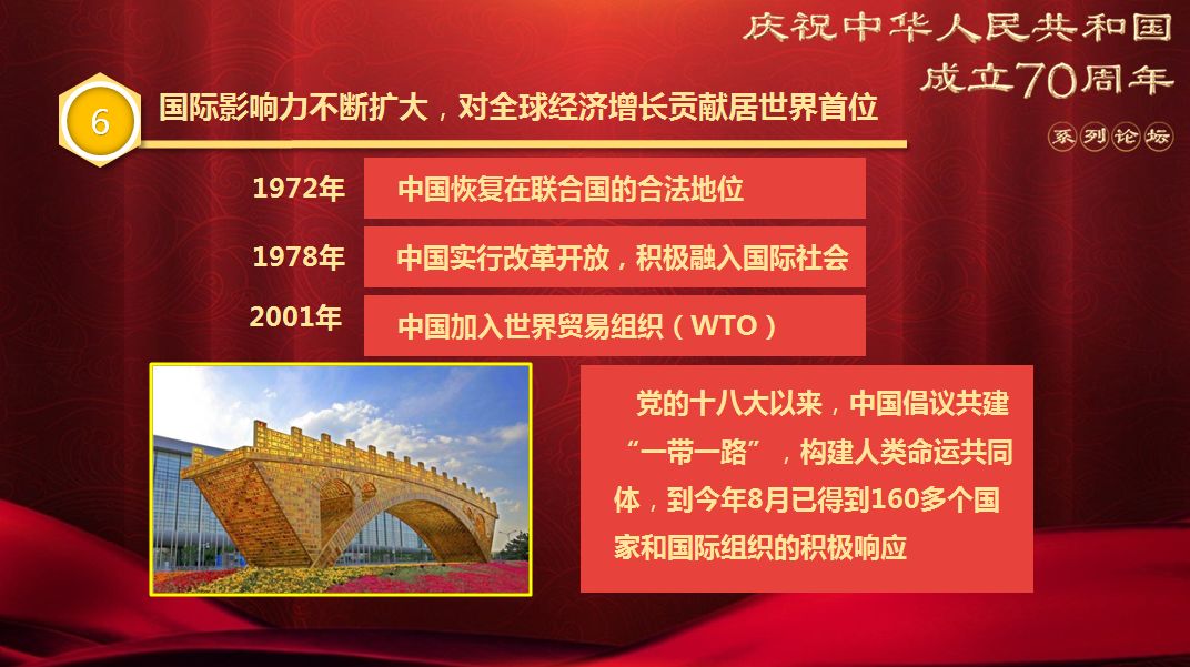 新中國成立之初,我們克服外來封鎖推進社會主義建設。1972年,中國恢複在聯合國的合法地位。1978年,中國實行改革開放政策,積極融入國際社會,在國際事務中日益發揮重要作用。2001年,中國加入世界貿易組織(WTO),以更加積極的姿態參與國際合作。