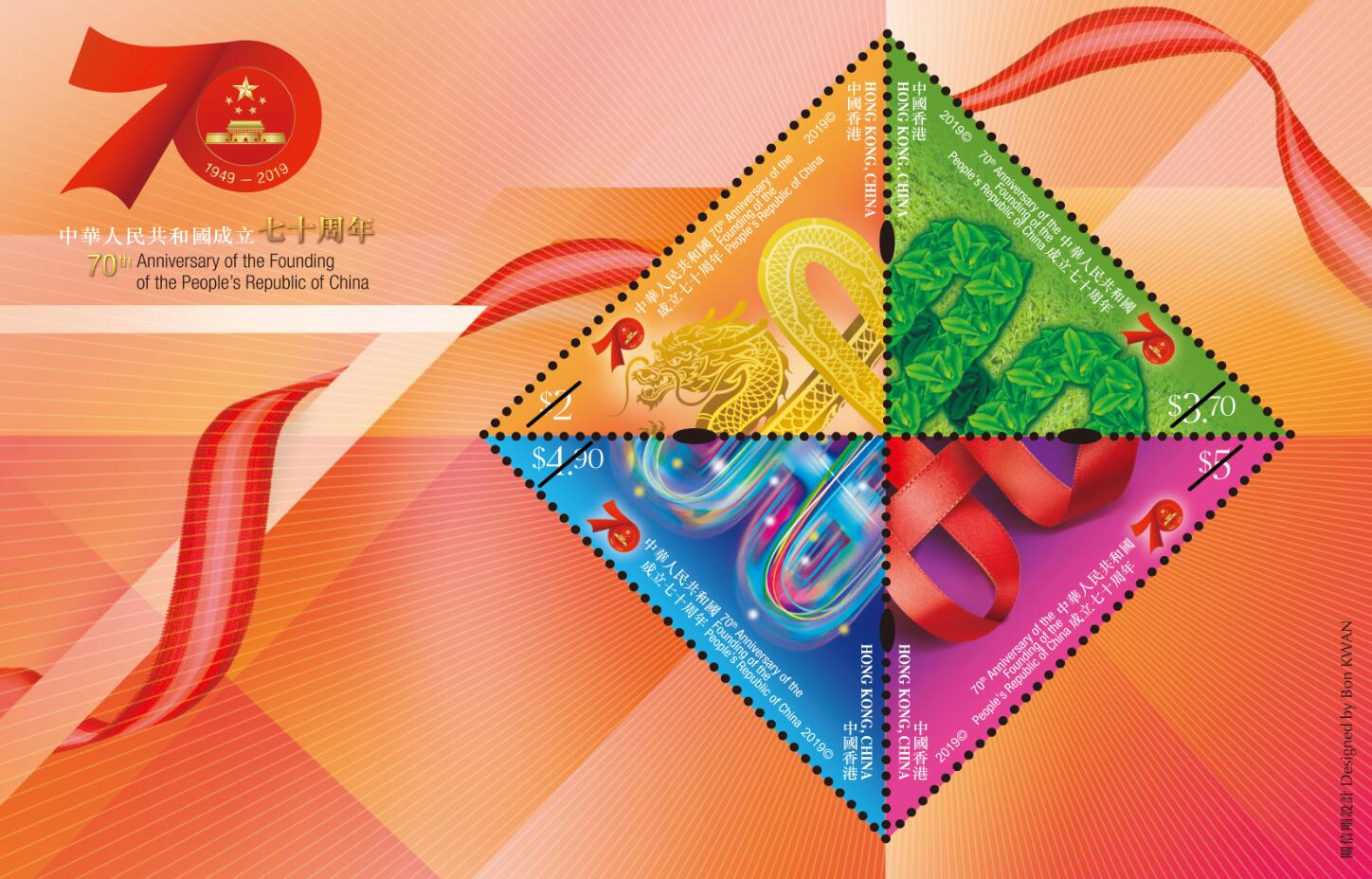 香港郵政國慶日以 「中華人民共和國成立七十周年」 為題發行 一套4枚郵票及一張郵票小型張。圖為小全張連一套4枚郵票。