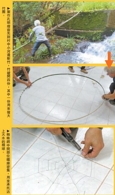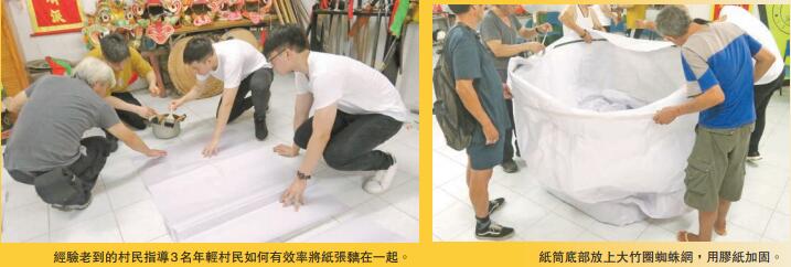 製作孔明燈確實有不少步驟,尤其大型的,需一定時間。筆者去年觀摩時,看不真,今年全程「 到實」。簡言之,先將多張紙用漿糊黐在一起成紙筒;將紙筒兩邊收成不漏氣的金字頂;紙筒底部放上「蜘蛛網」,這網實是由幼鐵線織成的大竹圈,中間密集部位用來承托沾了火水的棉球。