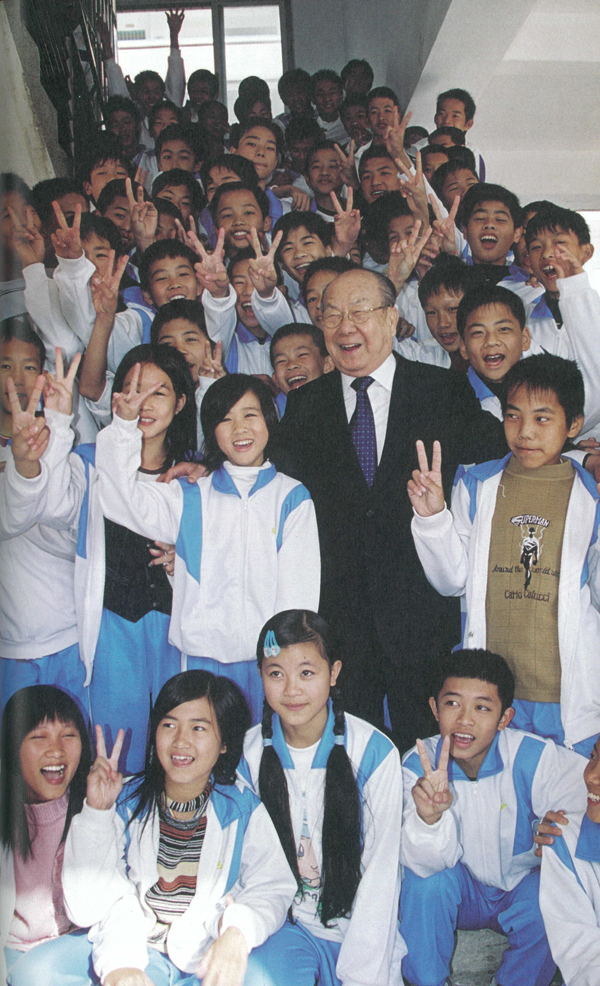 見證中國百年巨變的陳偉南,前半生隻身在港闖蕩,後半生傾力歸鄉奉獻,為香港、家鄉、祖國的進步與發展作出自己最大的努力。圖為陳偉南與寶山中學學子合影。