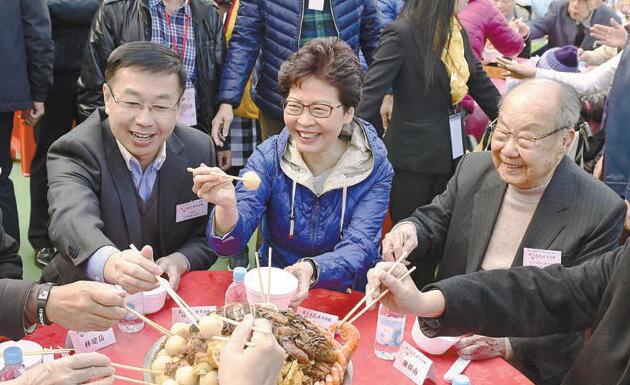香港潮屬社團總會在香港舉辦「萬人盆菜 寒冬送暖」活動。圖為2018年1月13日,特首林鄭月娥(中)與陳偉南(右)在盆菜宴現場。