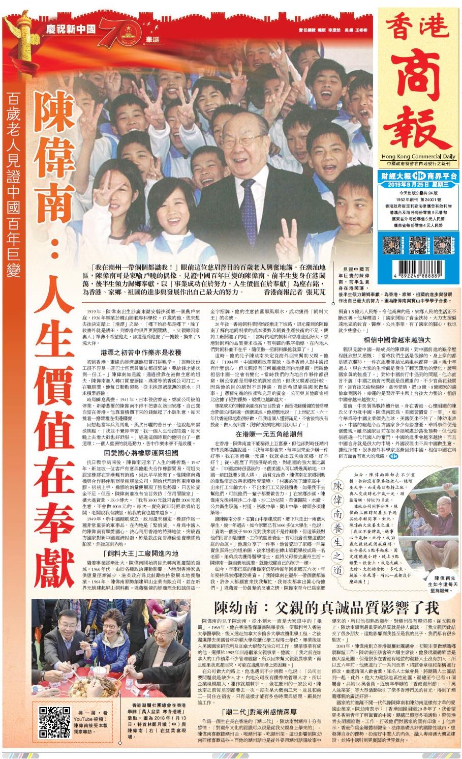 【香港商報網訊】「我在潮州一帶個個都識我!」眼前這位慈眉善目的百歲老人興奮地講。在潮汕地區,陳偉南可是家喻戶曉的偶像。見證中國百年巨變的陳偉南,前半生隻身在港闖蕩,後半生傾力歸鄉奉獻,以「事業成功在於努力,人生價值在於奉獻」為座右銘,為香港、家鄉、祖國的進步與發展作出自己最大的努力。香港商報記者 張芃芃