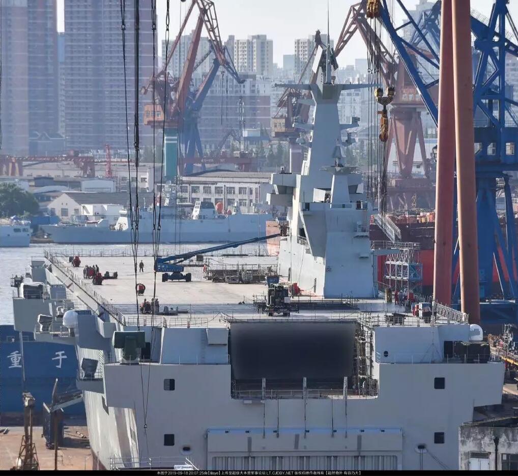 075级大型两栖攻击舰首舰的建造工作,进度惊人可谓“神速”。在8月中旬完成了涂漆和烟囱安装工作,随后,桅杆和舰岛安装了数个卫星通信系统,安装了最显眼的无线电设备:两座主要雷达。没多久,高清图片显示,舰上已经配备上了各种武器或战场感知系统的设备,随着海军灰刷漆工作的完成。军事爱好者分析,“整艘军舰在短短几周内从布满铁锈的分段,变为可以下水的完成品。”