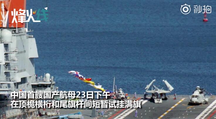 據香港《文彙網》9月23日報道,在新中國成立70周年大慶即將來臨之際,中國首艘國產航母23日下午在頂桅橫桁和尾旗杆間短暫試掛滿旗。甲板上已矗立起兩根巨型支柱,工人正在舉重臂上作業,疑似為相關慶典活動做准備。