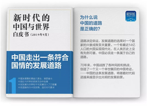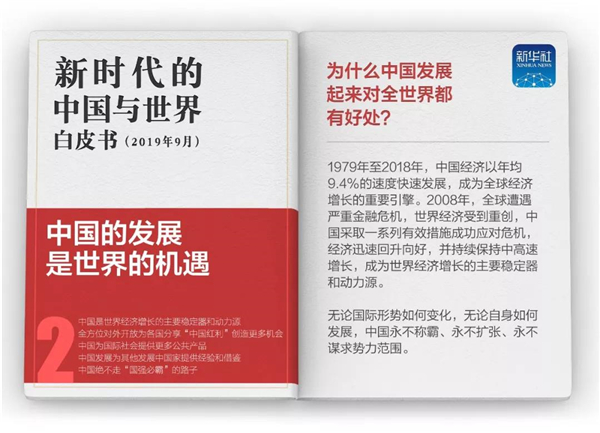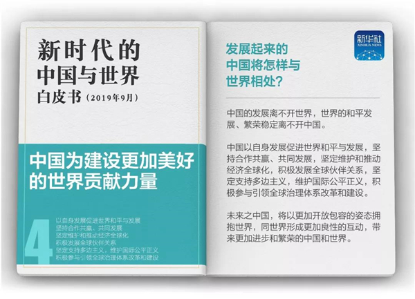 当前,中国发展进入了新时代。白皮书指出,新时代的中国,走中国特色社会主义道路的决心不会改变,与其他国家互学互鉴、合作共赢的决心不会改变,与世界携手同行的决心不会改变。未来之中国,将以更加开放包容的姿态拥抱世界,同世界形成更加良性的互动,带来更加进步和繁荣的中国和世界。