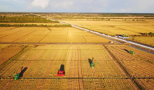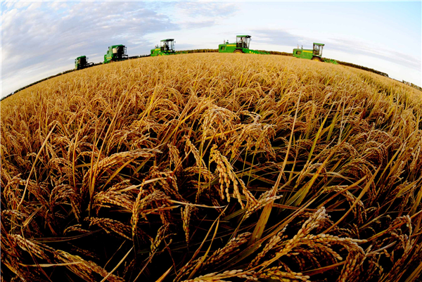 收割機在黑龍江省三江平原一處稻田收割水稻。新華社
