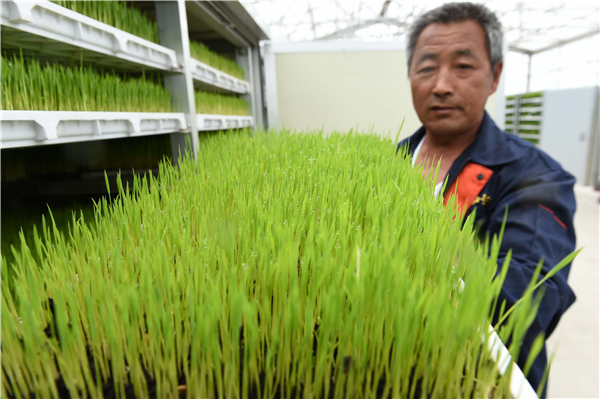 在黑龍江撫遠快速育秧車間,員工展示快速培育秧苗。新華社