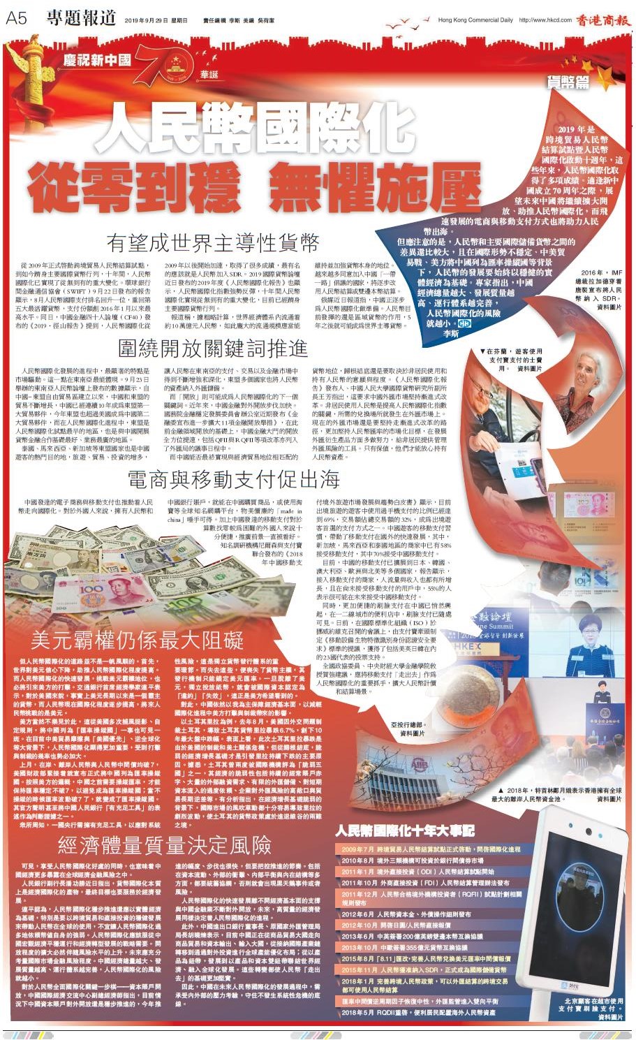 2019年是跨境貿易人民幣結算試點暨人民幣國際化啟動十週年,這些年來,人民幣國際化取得了多項成績。適逢新中國成立70周年之際,展望未來中國將繼續擴大開放、助推人民幣國際化,而飛速發展的電商與移動支付方式也將助力人民幣出海。