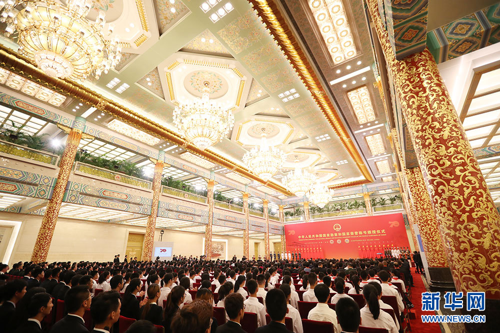 9月29日上午10时,中华人民共和国国家勋章和国家荣誉称号颁授仪式在人民大会堂隆重举行。图为颁授仪式现场。新华网