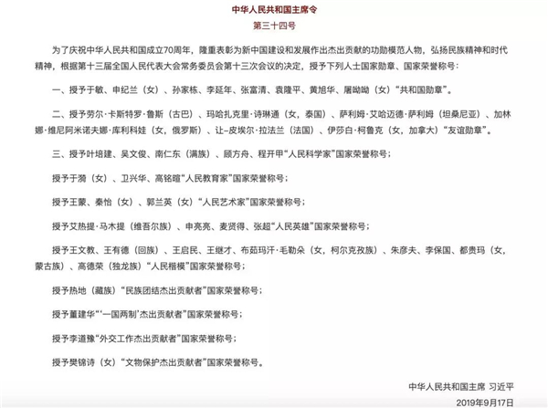 为了庆祝中华人民共和国成立70周年,隆重表彰为新中国建设和发展作出杰出贡献的功勋模范人物,弘扬民族精神和时代精神,根据第十三届全国人民代表大会常务委员会第十三次会议的决定,授予下列人士国家勋章、国家荣誉称号:
