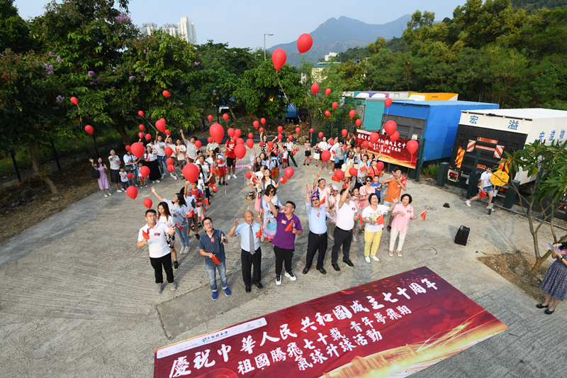 「義連班」主席劉德榮表示,是次活動召集了70名居民,當中包括青少年及家長等,各人手持鮮紅色的氣球,同心協力拼出大型「7」及「0」的數字,一同於下午4時15分共同放飛紅色氣球,寓意祖國騰飛,祝福國家繁榮安定、國泰民安。