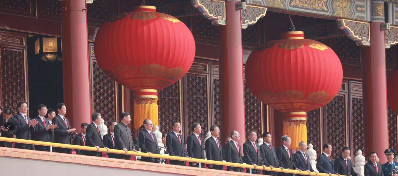 庆祝中华人民共和国成立70周年大会举行,习近平等党和国家领导人来到天安门城楼主席台。