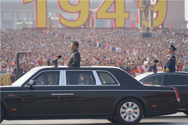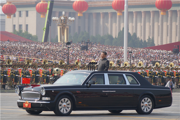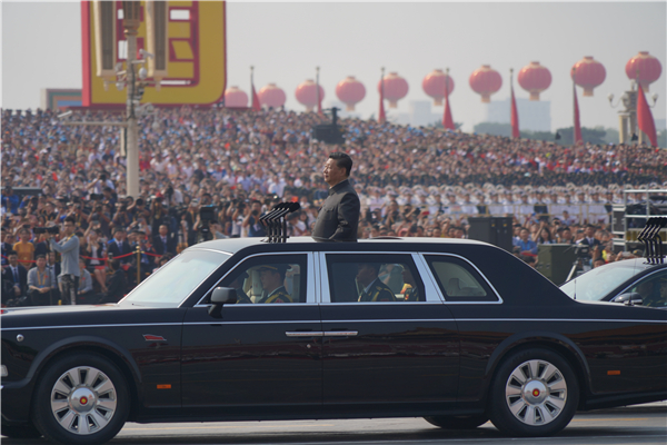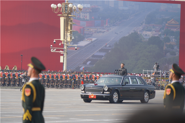 习近平乘坐检阅车,经过金水桥,驶上长安街。阅兵总指挥报告受阅部队列队完毕,习近平下达检阅开始的命令。