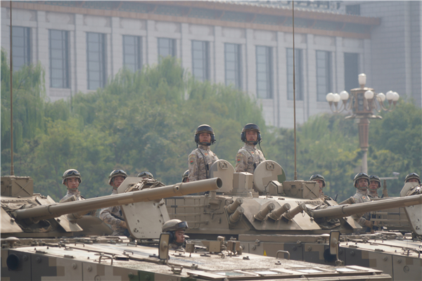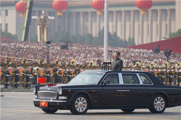 党旗、国旗、军旗迎风招展。习近平驱车来到三面旗帜前停车肃立,向旗帜行注目礼。随后,习近平乘车沿着宽阔的长安街检阅部队。
