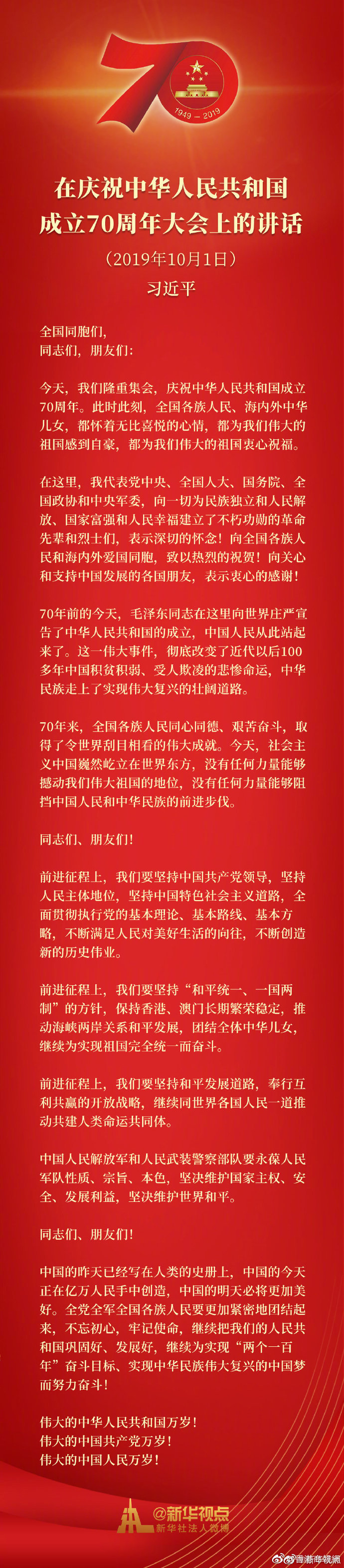 今天,我们隆重集会,庆祝中华人民共和国成立70周年。此时此刻,全国各族人民、海内外中华儿女,都怀着无比喜悦的心情,都为我们伟大的祖国感到自豪,都为我们伟大的祖国衷心祝福。