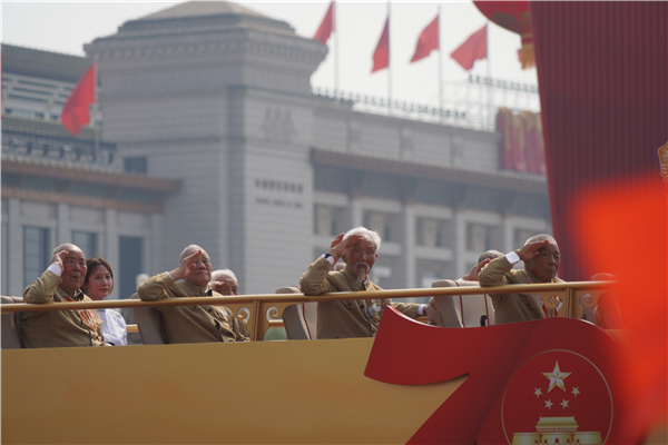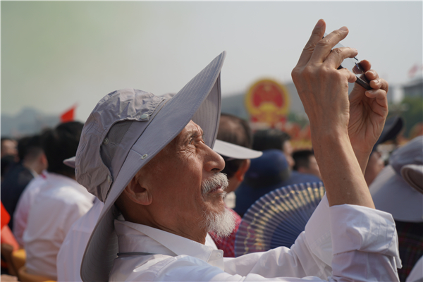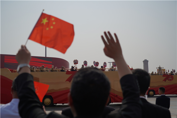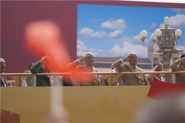 老兵經過向觀禮台敬禮時,嘉賓紛紛起身揮舞國旗。