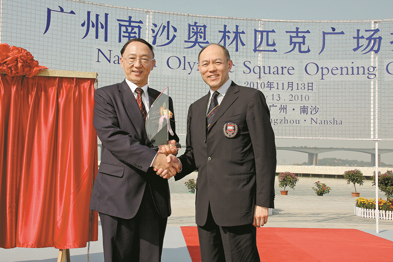 2011年,霍震寰(右)出席廣州南沙奧林匹克廣場揭幕儀式。